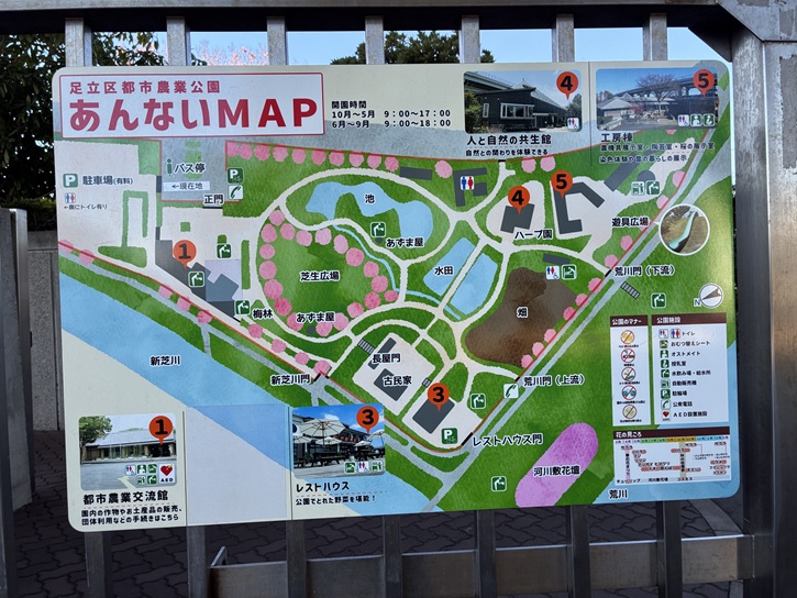 環七北通りに出て都市農業公園に向かいます。都市農業公園は、昭和五十九年(1984年)に開園し、平成七年(1995年)にニューアルオープンしました。入園は無料で、早朝夜間と年末年始などは休園となります。埼玉県との境界を流れる芝川が荒川に注ぐ河口付近に位置し、南側は荒川河川敷緑地に面しています。全国各地に作られている農業公園のひとつで、自然とのふれあい・植物栽培・園芸・農業への理解と教育、市民の憩いのために作られました。