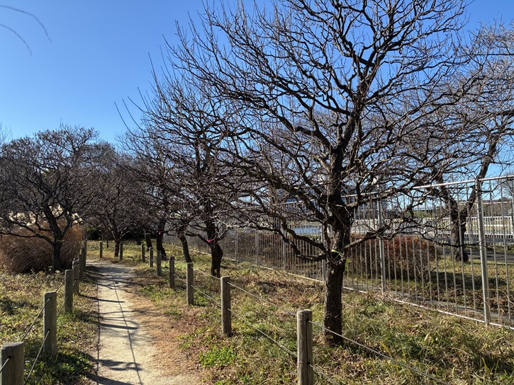かつてこの梅林は「タマカタカイガラムシ」という害虫により大変な被害にあっていました。そこで平成十七年ころから、梅の木の下に公園周辺でみられる野草(カラスノエンドウやムラサキツメクサなど)を移植して、植物とそこにやってくる昆虫類との共生を図りました。その結果、カイガラムシの天敵である「アカホシテントウ」がみられるようになり、同時にチョウやバッタなどのさまざまな昆虫類が増え、梅の害虫はほとんど姿を消しました。以後、この梅林では野草を一定の高さで刈り残すという手法で昆虫類の生息環境を残した管理をしています。この公園では、こうした生きものとの共生を大切にした植物管理を行っています。