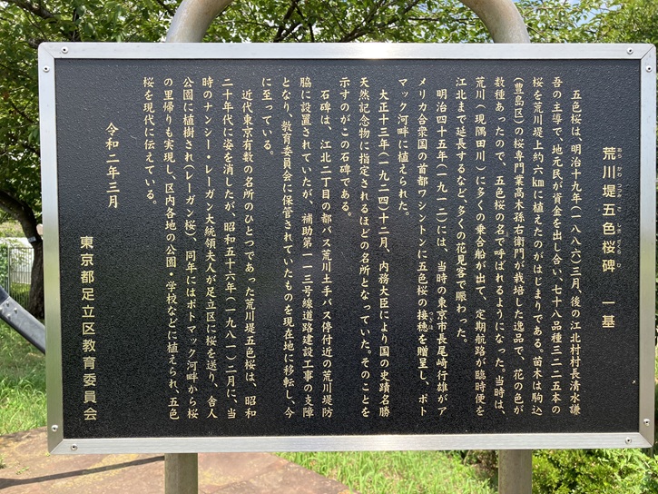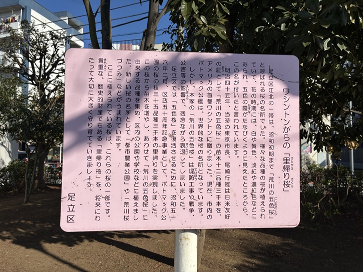 足立区江北の一帯は、昭和初期まで「荒川の五色桜」と呼ばれる桜の名所でした。様々な品種の桜が植えられていて、花の時期には、白や黄色、淡紅や濃紅色などに彩られ、五色の霞がたなびくように見えたところから。この名が付いたと言われています。明治四十五年、当時の東京市長、尾崎行雄は日米友好の証として「荒川の五色桜」の苗木十二品種三千本を、アメリカの首都ワシントンに贈りました。現在、市内のポトマック公園は、世界的な桜の名所となっています。しかし、本家の「荒川の五色桜」は堤防工事や戦争、公害等の影響で、残念ながら衰退してしまいました。足立区では「五色桜」を復活させるために、昭和五十六年二月、区政五十周年記念事業として、ポトマック公園の桜の枝三十五品種三千本の里帰りを実現しました。この枝から苗木を増やし、あわせて「荒川の五色桜」に由来する品種を集め、区内の公園や学校などに植えました。新しい桜の名所として「都市農業公園」や「荒川桜づつみ」などがうまれています。ここに植えられている桜は、これらの桜の一部です。貴重な、歴史的財産でもある「里帰り桜」を、招来にわたって大切に大きく守り育てていきましょう。
