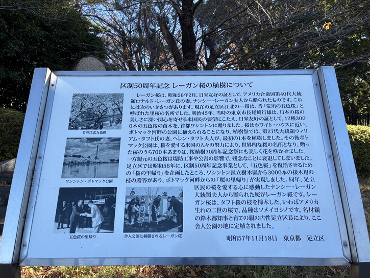 日米両国の友好をしるした「レーガン桜」は、明治末頃、江北の荒川堤に咲き誇った五色桜に由来する。明治四十五年、尾崎東京市長は、五色桜をワシントンに贈った。時のタフト大統領夫人は、その桜をポトマック河畔にお手植えし、その後同河畔は桜の世界的名所となった。昭和五十六年2月、足立区は桜の名所復活を願い、桜の里帰りを実現させた。同年、桜を愛する心に感動されたレーガン大統領夫人は、「タフト桜」からのさし木苗を日本国民に贈られた。この桜を東京都知事鈴木俊一は「レーガン桜」と命名し、足立区長古性直と共に、区制50周年を記念してこの地に植樹した。