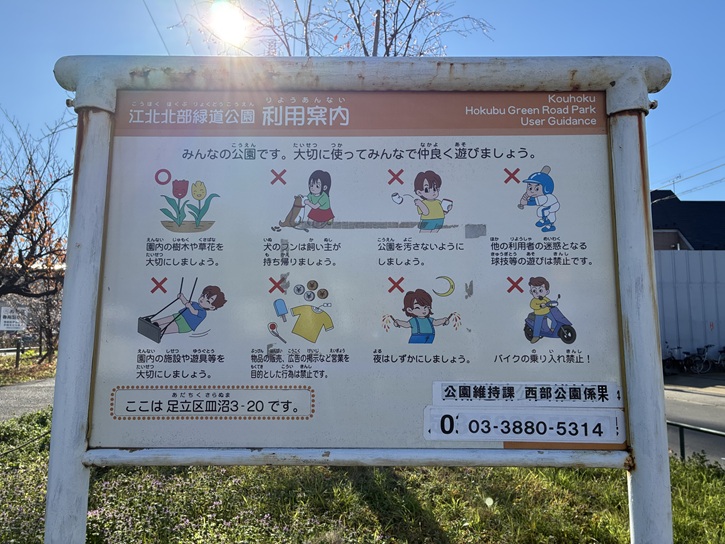 舎人公園を出て、北足立市場北交差点から谷在家公園まで南北に連なる長〜〜〜い江北北部緑道公園に入ります。