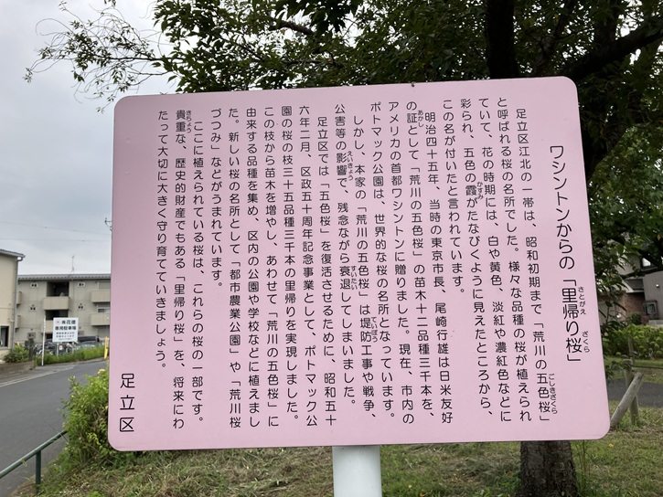 足立区江北の一帯は、昭和初期まで「荒川の五色桜」と呼ばれる桜の名所でした。様々な品種の桜が植えられていて、花の時期には、白や黄色、淡紅や濃紅色などに彩られ、五色の霞がたなびくように見えたところから。この名が付いたと言われています。明治四十五年、当時の東京市長、尾崎行雄は日米友好の証として「荒川の五色桜」の苗木十二品種三千本を、アメリカの首都ワシントンに贈りました。現在、市内のポトマック公園は、世界的な桜の名所となっています。しかし、本家の「荒川の五色桜」は堤防工事や戦争、公害等の影響で、残念ながら衰退してしまいました。足立区では「五色桜」を復活させるために、昭和五十六年二月、区政五十周年記念事業として、ポトマック公園の桜の枝三十五品種三千本の里帰りを実現しました。この枝から苗木を増やし、あわせて「荒川の五色桜」に由来する品種を集め、区内の公園や学校などに植えました。新しい桜の名所として「都市農業公園」や「荒川桜づつみ」などがうまれています。ここに植えられている桜は、これらの桜の一部です。貴重な、歴史的財産でもある「里帰り桜」を、招来にわたって大切に大きく守り育てていきましょう。