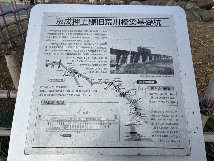 京成電気軌道株式会社施工の工事は、向島・四ツ木間2、224.9mの線路変更工事で、その荒川及び綾瀬川橋梁は杭打基礎に支持された4橋台、25橋脚の上に鋼板桁54連を架設し、向島、四ツ木方面に向かって、線路の盛土をしたものでした。この橋は元々放水路に通水する前に、短いスパンで低い橋脚を並べた構造であった上、昭和三十年代の高度成長期に、荒川周辺において大量の地下水を使用したことで起こった地盤沈下でさらに約1.7m下がり、さらに戦後の堤防嵩上げの際にも線路部分だけは低いまま存置されるなど、水運、水防上のネックになっていました。そのため50年代から掛け替え計画が策定されていましたが、平成三年1月の橋桁へのタンカー衝突事故を契機に一気に計画が進み、ついに平成十一年9月4日には上下とも新橋梁への切り替えが終了しました。