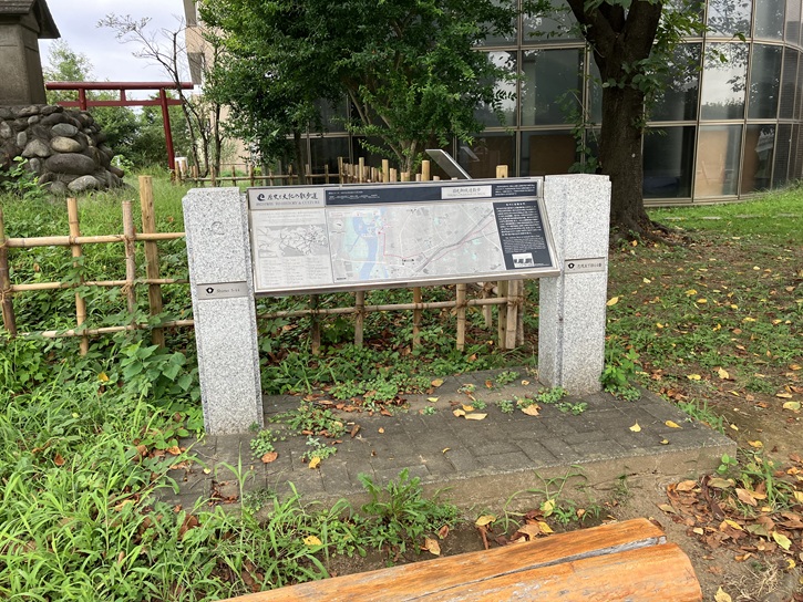 谷在家公園から環七北通りに出ます。環七北通りに面して、鹿浜村小名押部の鎮守社として祀られていた押部八幡神社があります。祭神は譽田別尊で、寛延元年(1748年)に横田源右衛門政信という人物の発案で勧請されたと伝えられています。押部八幡神社には、明治四十一年(1908年)に鯨を生け捕りにした珍しい絵馬が残されています。その絵馬には「明治四十一年3月28日の午前7時頃、吉田勘治郎が船で下流に漕いでいたところ、千住大橋の上流の深瀬に水を吹き上げながら鯨が現れました。人を飲み込もうとする程に大口を開ける鯨に驚き、竹棹で格闘の末に生け捕りに成功し、千住大橋際に引き揚げられた鯨は長さ1丈9身6尺あったそうです。各新聞社も駆けつけ、5日間人々に見せた後に佃浜へと贈った」といった内容が記されていて、歴史を感じさせる貴重な絵馬です。この絵馬は、8月下旬に行われる祭礼日の際に社殿の扉が開かれ、その時に見ることができます。