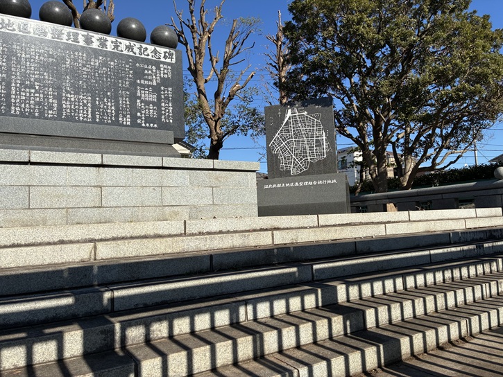 記念碑の左手には関係者の氏名を記した石碑、右手には区画整理の対象となった地域の図を記した石碑が建っています。総面積は、152.06ヘクタールに及んでいます。ちなみに、1ヘクタールは10、000平方メートルに相当し、これは100mX100mの正方形の面積と同じです。身近な例では、東京ドームの約2.1個分に匹敵する広さです。つまり、東京ドームが320個収まる計算になります。