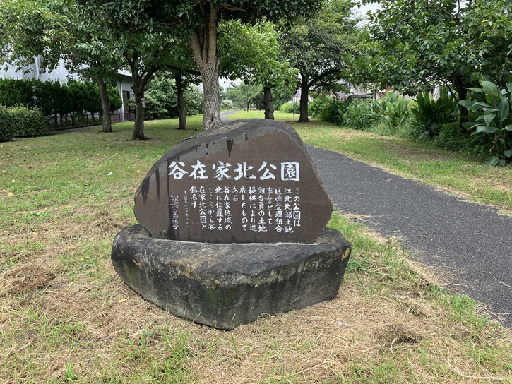 この公園は、江北北部土地区画整理組合事業として組合員の土地提供により造成したものである。谷在家地域の北に位置するところから、谷在家北公園と銘名す。