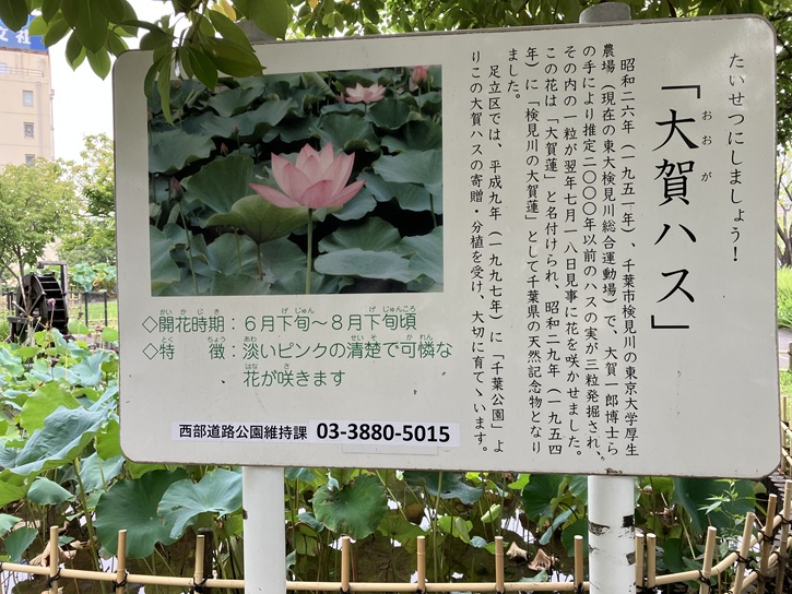 昭和二十六年(1951年)、千葉市検見川の東京大学厚生農場(現在の東大検見川総合運動場)で、大賀一郎博士らの手により推定2000年以前のハスの実が三粒発掘され、その内の一粒が翌年七月十八日見事に花を咲かせました。この花は「大賀蓮」と名付けられ、昭和二十九年(1954年)に「検見川の大賀蓮」として千葉県の天然記念物となりました。足立区では、平成九年(1997年)に「千葉公園」よりこの大賀ハスの寄贈・分植を受け、大切に育てゝいます。