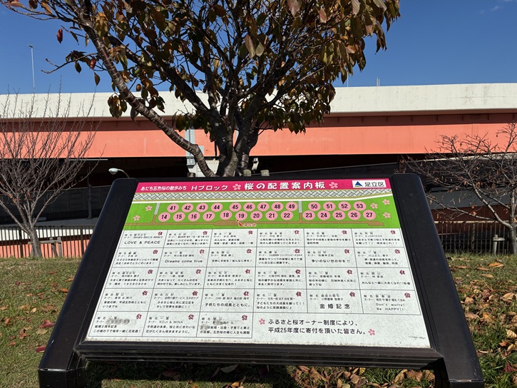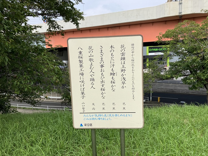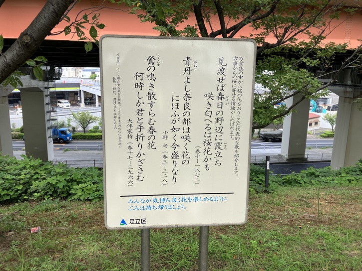 桜並木の遊歩道は「あだち五色桜の散歩みち」と名付けられ、遊歩道の脇には和歌や俳句が書かれた掲示板が立っています。