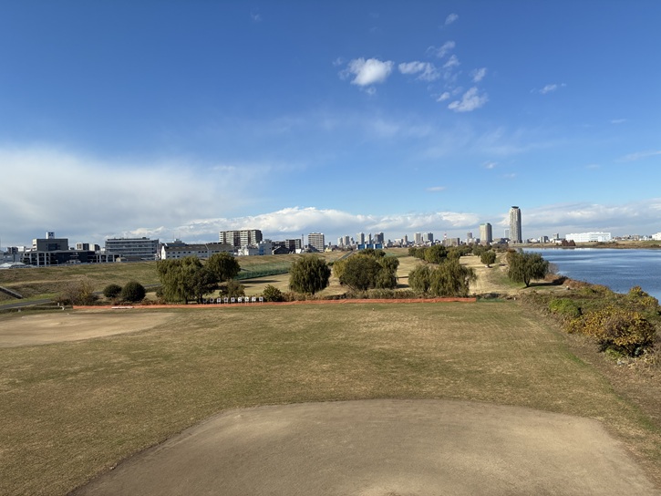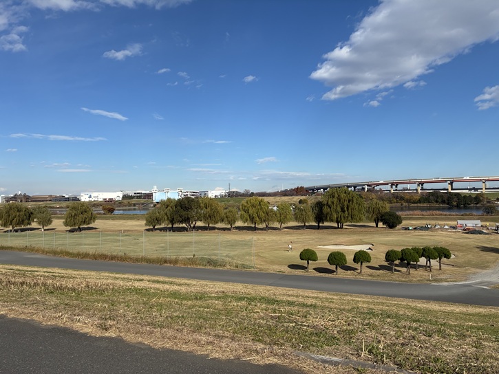 鹿浜橋を渡り、荒川土手右岸の遊歩道に入ります。河川敷にはゴルフ場が広がっています。新東京都民ゴルフ場は、日本のセント・アンドリュースと言われ、河川敷ゴルフ場の発祥の地とされています。都心に最も近い場所の荒川沿いに位置していて、年間を通して手頃な料金で楽しむことができるミニゴルフ場です。このコースは河川敷にあり、平坦ながらも自然の地形を生かしたアンジュレーションに加え、点在する柳と池や土手、そして河川特有の風が楽しめる9ホールのゴルフ場です。ビギナーからベテランまで、子どもからシニアまで、エンジョイ志向から競技志向まで楽しめる「都会の穴場」です。