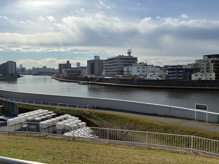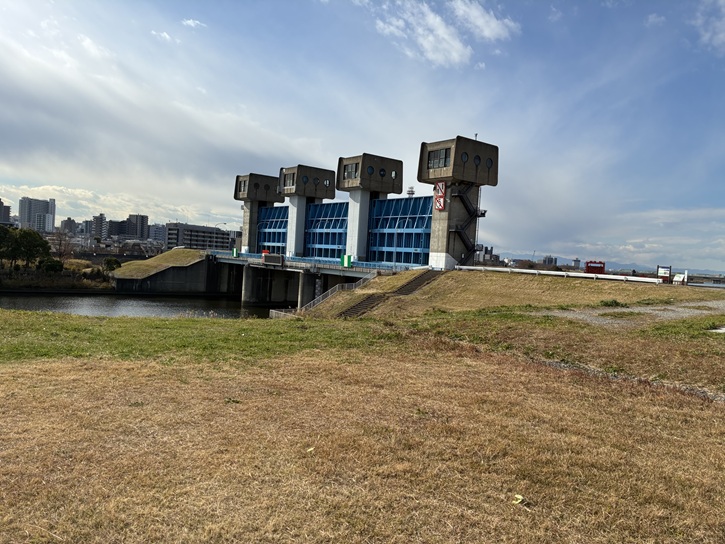 新河岸川が隅田川に合流する地点に、荒川と隅田川を仕切る岩淵水門(青水門)があります。