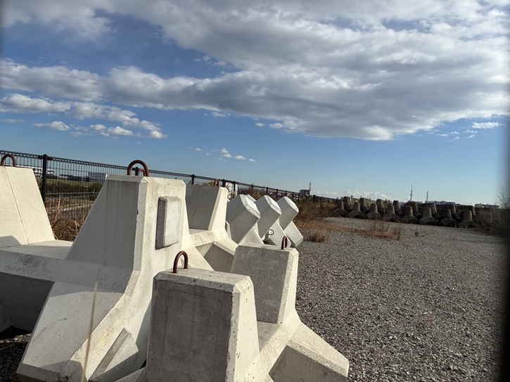水門前の土手上に沢山のテトラポットが備蓄されています。消波ブロックは、海岸や河川などの護岸の水制を目的に設置するコンクリートブロックです。消波根固ブロック・波消しブロックと呼ばれることもあります。日本では、消波ブロックの代表的なものとして「テトラポッド」が挙げられます。