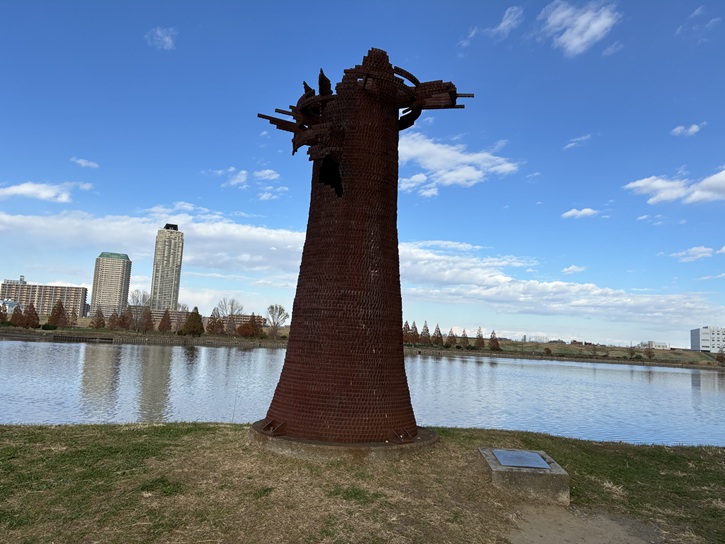 荒川リバーアートコンテストは、荒川クリエーション実行委員会主催により行われ、荒川の広々とした空間に映る美的造型物として、河川敷に設置することを条件に公募したものです。