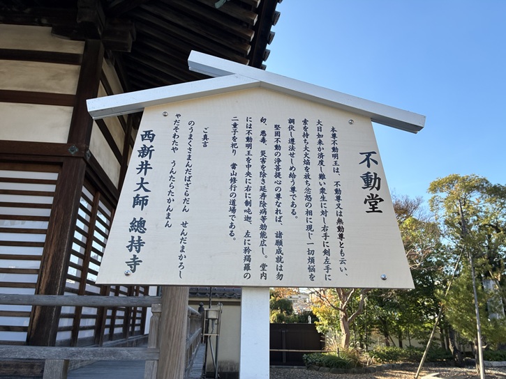 本尊不動明王は、不動尊又は無動尊とも云い、大日如来か済度し難い衆生に対し、右手に剣、左手に索を持ち、大火焔を放ち、忿怒の相に現じ、一切煩悩を調伏し、遵法せしめ給う尊である。堅固不動の浄菩提心の尊なれば、諸願成就は勿勿、悪毒、災害を除き、延寿除病等効能広し。堂内には不動明王を中央に、右に制迦、左に矜羯羅の二童子を祀り、當山修行の道場である。