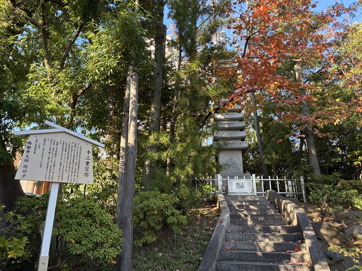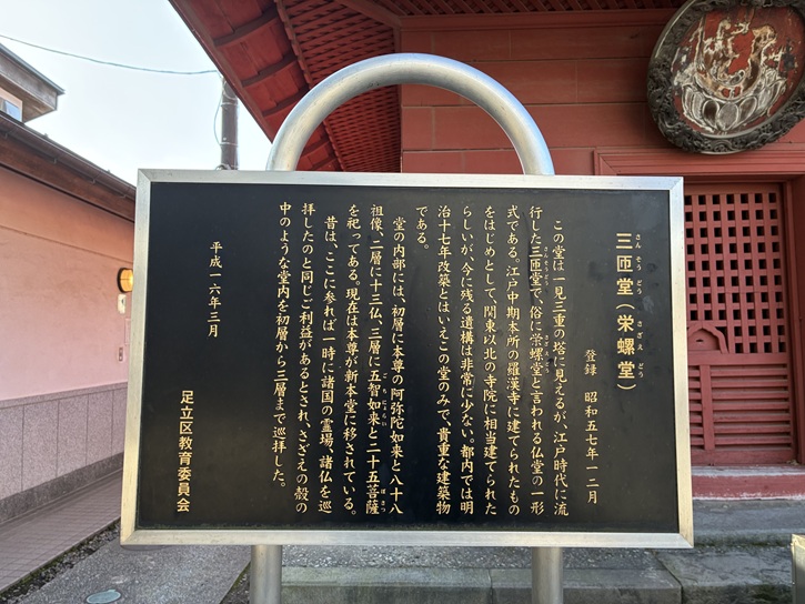 塩地藏の左手に、紅殻色の唐風の三重塔が建っています。三匝堂(さんそうどう)は、明治十七年に建立され、足立区の指定文化財になっています。都内に残る唯一の栄螺堂で、古くは登ることができましたが現在は内部は非公開になっています。