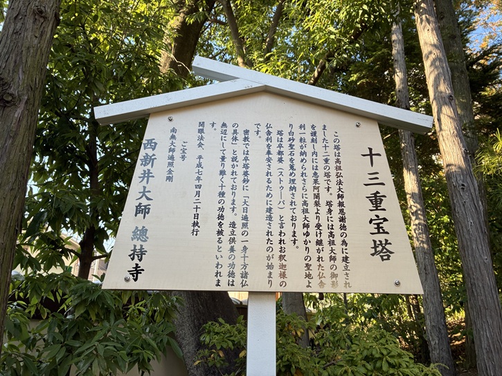 この塔は、高祖弘法大師報恩謝徳の為に建立されました十二重の塔です。塔身には高祖大師の御影を謹刻し、内には恵果阿闍梨より受け継がれた仏舎利一粒が納められ、さらに高祖大師ゆかりの聖地より白砂聖石を蒐め埋納されております。塔は卒都婆(ストゥーパ)と言われ、お釈迦様の仏舎利を奉安されるために建造されたのが始まりです。密教では卒塔婆鈔に「大日遍照の一身十方諸仏の具体」と説かれております。造立供養の功徳は無辺にして、量り難く十種の功徳を被るといわれます。