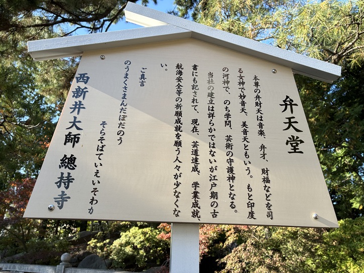 本尊の弁財天は音楽、弁才、財福などを司る女神で妙音天、美音天ともいう。もと印度の河神で、のち学問、芸術の守護神となる。当社の建立は詳らかではないが、江戸期の古書にも記されて、現在、芸道達成、学業成就、航海安全等の祈願成就を願う人々が少なくない。