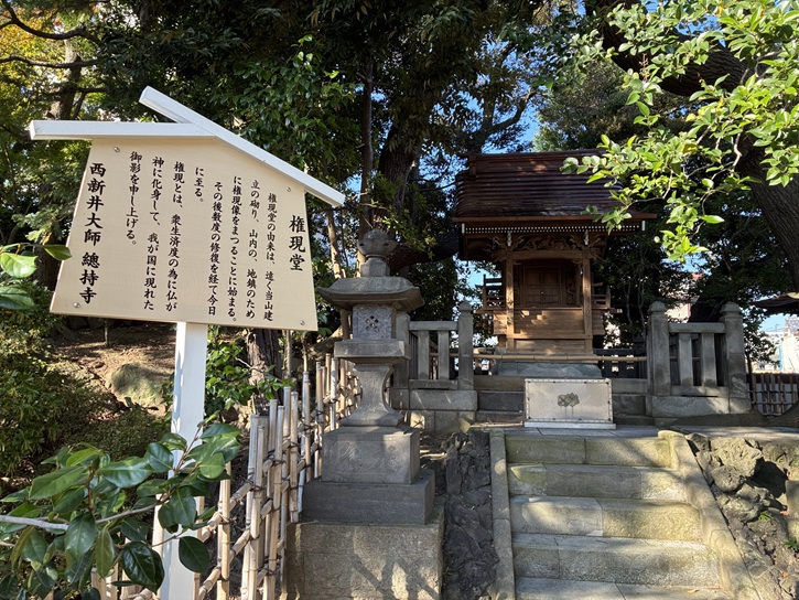 権現堂の由来は、遠く当山建立の砌り、山内の、地鎮のために権現像をまつることに始まる。その後数度の修復を経て今日に至る。権現とは、衆生済度の為に仏が神に化身して、我が国に現れた御影を申し上げる。