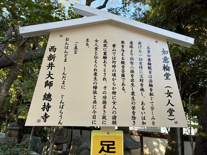 本尊如意輪観音は、法輪を転じて苦しみを受ける一切有情に宝財を施し、あるいは如意珠より福智二徳を出生し、衆生の苦を除き楽を与える観音菩薩である。當山では、何時の頃からか、特に女人の諸願成就に霊験ありとされ、その功徳多き故に女人堂と伝えられ、衆生の帰依と共に今日に至る。