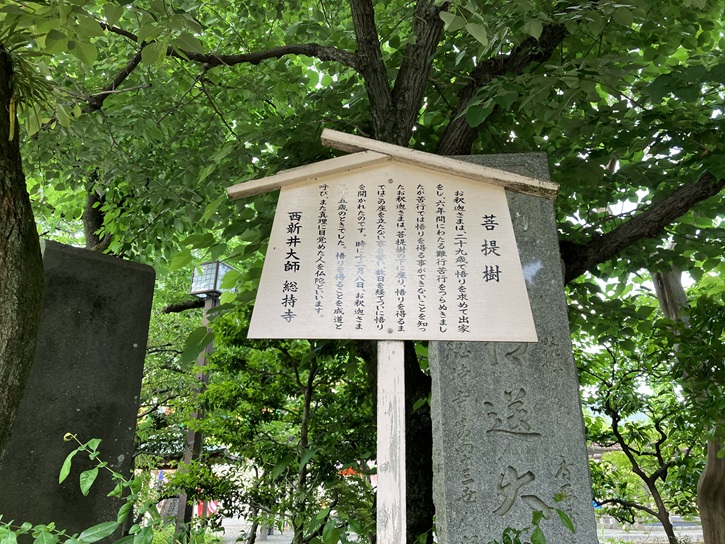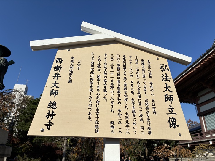 空海は平安時代初期の僧で、真言宗の宗祖です。西新井大師は、空海(弘法大師)が関東巡錫の途中で西新井を通った際、本尊である観音菩薩の霊託を聞き、本尊の十一面観音を彫り、天長三年(826年)に寺院を建立したことに始まるとされています。江戸時代中期に建立された本堂は、昭和四十一年(1966年)に火災によって焼亡しましたが、本尊は難を逃れました。本堂は昭和四十六年(1971年)に再建]されました。川崎大師などと共に「関東三大師」のひとつに数えられ、毎年の正月には初詣の参拝客で賑わいます。境内には、弘法大師によってもたらされたとされる加持水の井戸があります。この井戸が本堂の西側に所在することが当地の地名である西新井の名の由来とされています。中野区にある新井薬師と同じ真言宗豊山派の寺院です。境内に、空海の銅像が建っています。