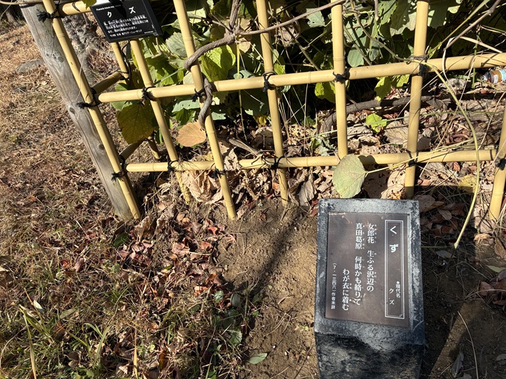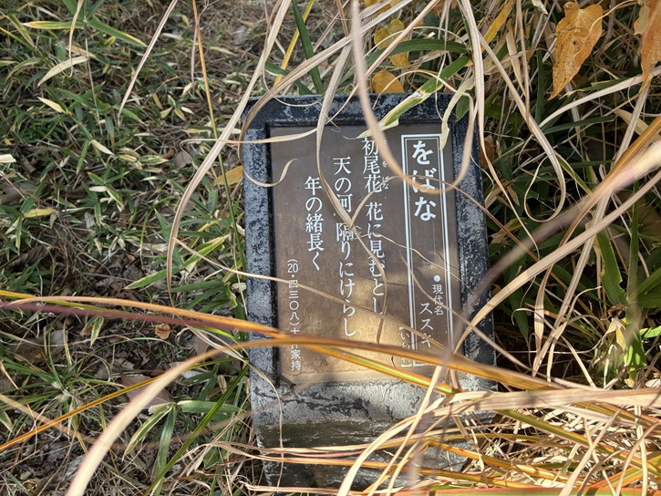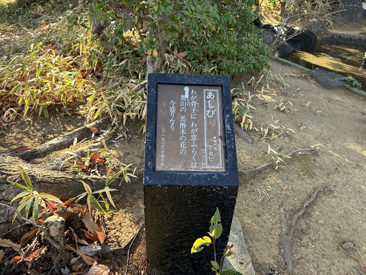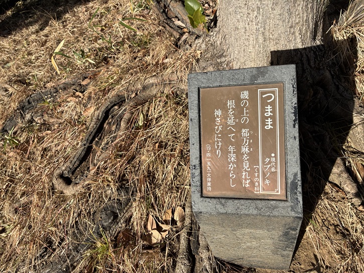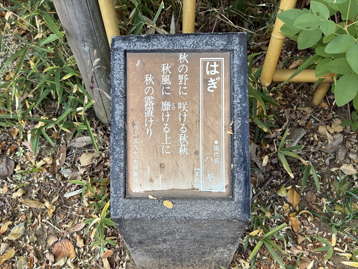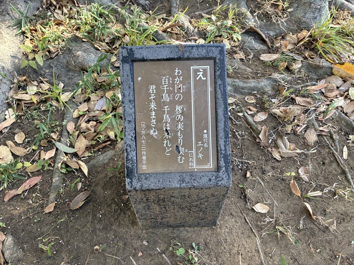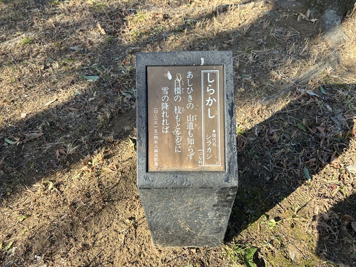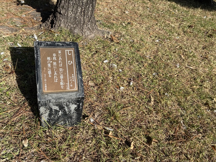 園内には多くの樹木が植えられています。それぞれの木には万葉集の和歌が添えられています。私の単純な理解では、この和歌は「家にいると器によそうご飯を、今は旅の途中なので椎の葉に盛ります。」としか思えません。有間皇子は、大化の改新で活躍した中大兄皇子と同じ時代の人物です。有間皇子は中大兄皇子と不仲で、謀反をたくらんでいました。しかし一緒に計画をしていたはずの蘇我赤兄に裏切られ、計画がばれて捕まってしまいます。この和歌に詠まれている「旅」とは、捕まったあと護送されているときのことで、彼の運命に対する悲しみや無力感が込められています。捕らわれて護送される途中で、満足な食器もなく、葉っぱに飯を盛っている状況を詠んでいます。彼の不遇な境遇と、家に残してきた人々への思いを反映しています。