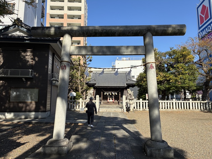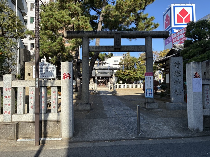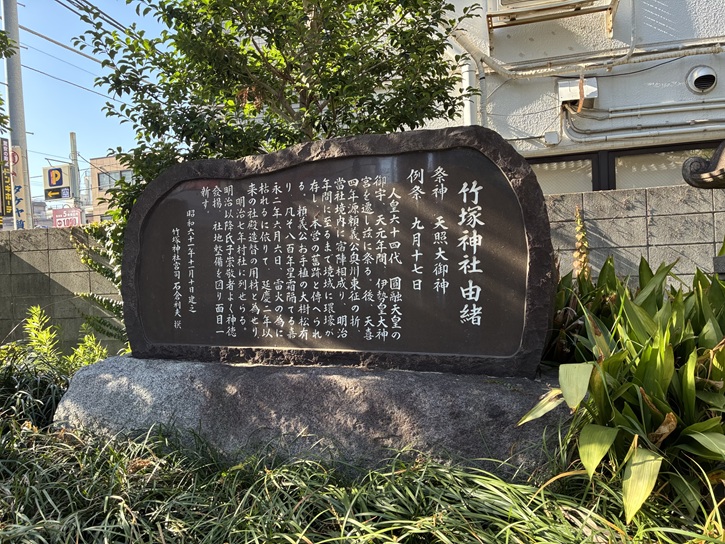 ドンキ竹の塚店と小路を隔てて竹塚神社があります。入口は竹の塚センター通りから交差点を左折したところにあります。竹塚神社は、天元年間(978年〜983年)に伊勢神宮を勧請して創建されました。天喜四年(1056年)に源頼義が奥州征討に出征する際、ここに陣を構え、松を植えたといわれています。この松は、嘉永二年(1849年)に雷が落ちて枯死してしまいました。その後、松の木は神社の改築時に用材の一部にしたと伝えられています。明治七年に村社に列格しました。