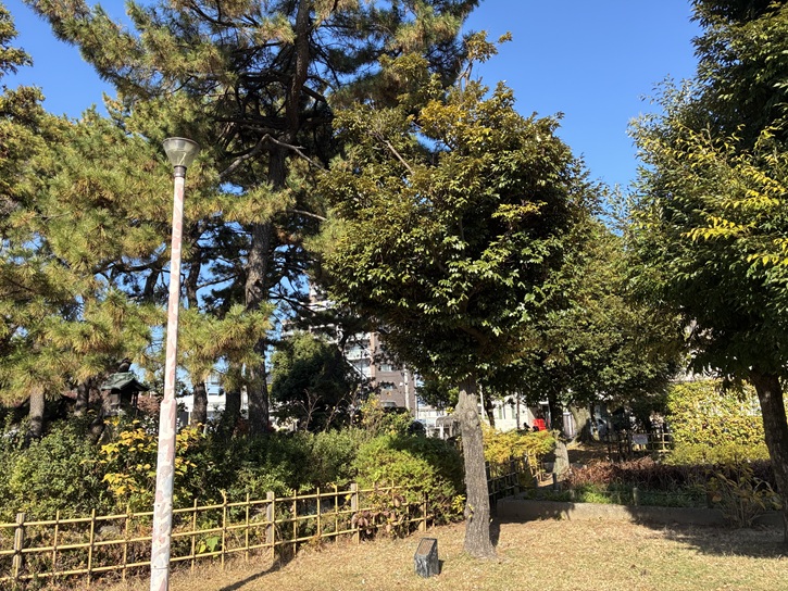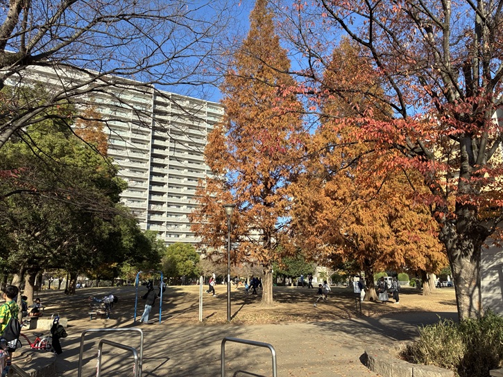 公園には高木が林立し、周囲の高層住宅の住民の憩いの場になっています。