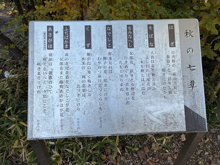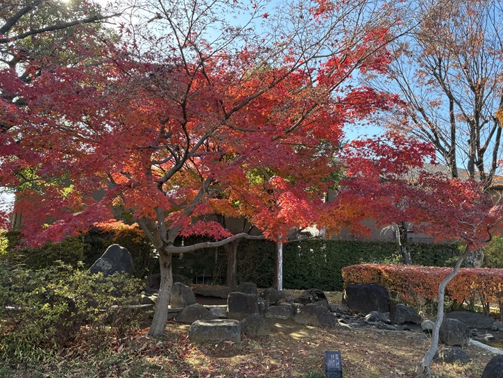 2025年に再訪した時は晩秋の季節で、紅葉真っ盛りでした。もみじは紅葉する植物の総称をいいます。モミジに該当する植物としては、「かへるで」といった場合のカエデ(かへるて:蝦手・加流敝弖)属のイロハモミジ(タカオカエデ)やオオモミジなどやウルシの仲間を指します。葉の形のユニークさといい赤や黄色といい、庭園には欠かせない樹木となっている樹木です。「もみじ」は、華麗な花をつけるわけではないのですが、秋山を美しく彩ることから、万葉集には多くの歌に詠み込まれています。現在では「もみじ」というと、一般には紅葉を指しますが、万葉時代はほとんど「黄葉」と記されていました。これは、秋の深まりとともに葉の色が変わっていくことを「黄変つ(もみつ)」という動詞で表現したからで、別段万葉人が赤色と黄色の違いを識別していなかった訳ではありません。この歌でも葉が紅葉していく様子が「黄変つ」で表されています。歌の「妹」・「恋」は男女間恋愛を詠んだものではなく、姉が文字通り妹を慕って贈ったものです。作者の大伴田村大嬢(おほをとめ)は、大伴旅人の弟である宿奈麻呂の娘で、異母妹の坂上大嬢に親愛の情を抱いていました。それは、田村大嬢が、万葉集に残した八首の歌のすべてが妹の坂上大嬢に贈ったものであるということからもわかります。現代語訳では、「私の家に黄葉するかえでを見るたびに、あなたを心にかけて恋しく思わぬ日はありません。」となります。