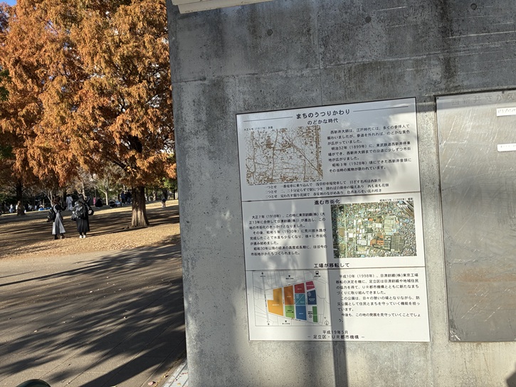 平成十年(1998年)、日清紡績(株)東京工場移転の決定を機に、足立区は日清紡績や地域住民の協力を得て、UR都市機構とともに新たなまちづくりに取り組んできました。この公園は、日々の憩いの場となりながら、防災公園として住民とまちを守っていく機能を担っています。今後も、この地の発展を見守っていくことでしょう。