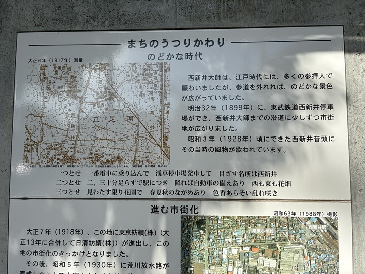 西新井大師は、江戸時代には、多くの参拝人で賑わいましたが、参道を外れれば、のどかな景色が広がっていました。明治三十二年(1899年)に、東武鉄道西新井停車場ができ、西新井大師までの沿道に少しずつ市街地が広がりました。昭和三年(1928年)頃にできた西新井音頭にその当時の風物が歌われています。