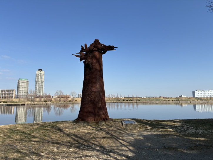 浮間公園に着きました。浮間公園は、東京都北区浮間二丁目と板橋区舟渡二丁目の境にある浮間ヶ池を中心にした都立の都市公園(総合公園)です。江戸時代から明治時代にかけて、浮間付近で荒川は大きく南に蛇行していました。昭和三年(1928年)頃に荒川が直線化された際、荒川の旧流路の一部が取り残され、その名残りとして浮間ヶ池ができました。それまで荒川の左岸側(埼玉県側)だった浮間は、このとき右岸側(東京府側)になりました。浮間ヶ池はU字蛇行部の西の一部にあたり、池の東にある現在の浮間地区が荒川改修で埼玉県側から移った町域に相当します。昭和四十二年(1967年)、東京都は浮間ヶ池を含めた周辺地域を都立浮間公園としました。昭和六十年(1985年)に浮間舟渡駅が開業すると、浮間公園の入り口は駅前広場と道路一つを隔てて相対する現在の姿になりました。