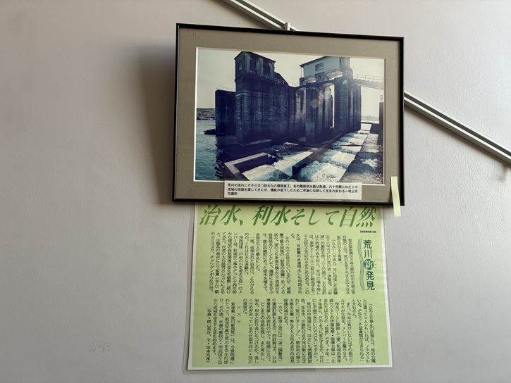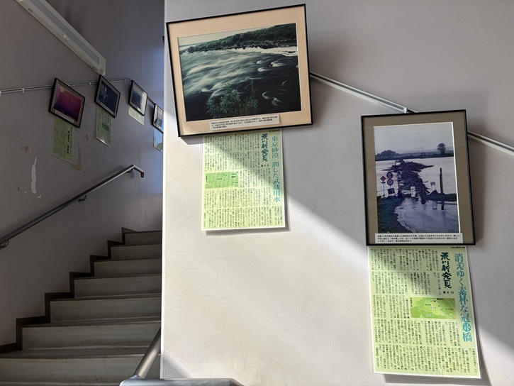 階段の壁には、荒川についての夥しい数の新聞の連載の切り抜きが貼られています。