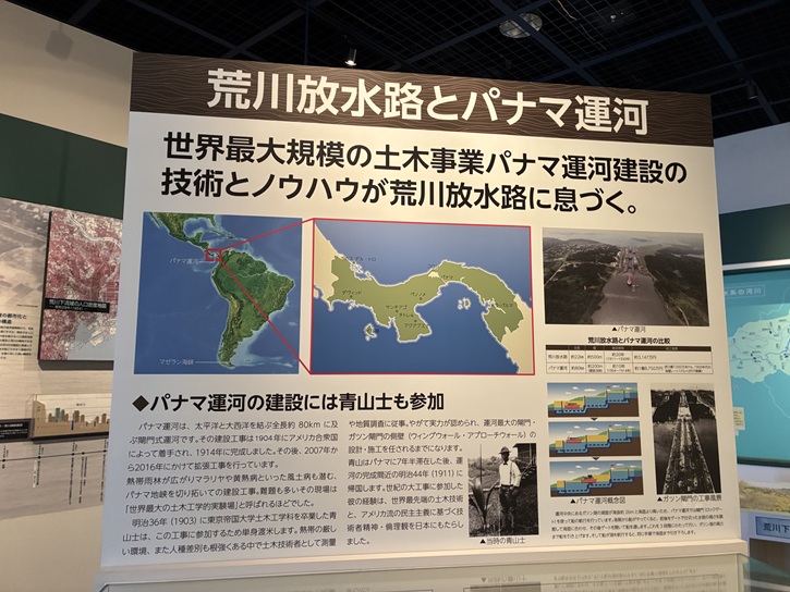 荒川放水路とパナマ運河について、パネルで解説されています。