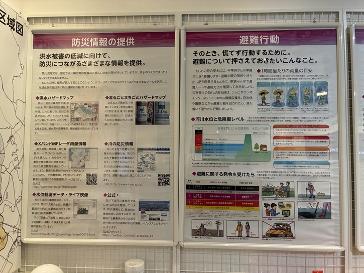 資料館には、荒川に関する様々な資料が展示されています。3階には、図書室と荒川流水模型の屋上展示施設があります。図書室は、河川工学者で知られる宮村忠氏の著作や蔵書が収蔵されています。