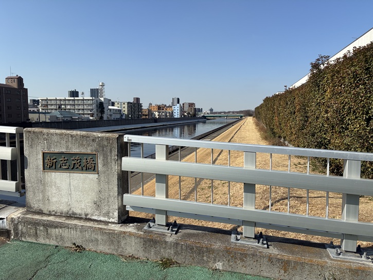 新河岸川に架かる新志茂橋の手前から川沿いに細い遊歩道が延びています。私が持っている古い地図では「志茂橋」と表示されていますが、志茂橋は昭和五十五年(1980年)に架けられましたが、耐震性の問題があるとして、国土交通大臣になった北区選出の政治家の主導で改修工事をし、平成二十五年(2013年)8月に新たな橋として「新志茂橋」と名付けられました。そろそろ地図を買い換えないと。