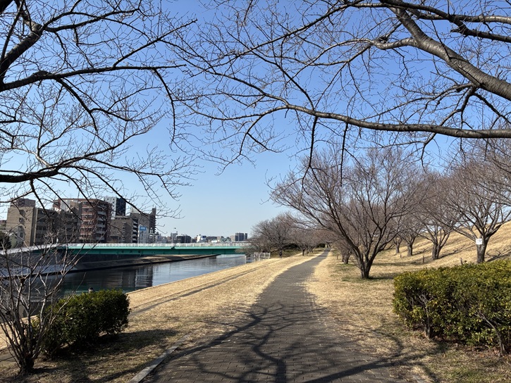 土手側の遊歩道は、両側に桜の並木が続いていて、春には桜のトンネルとなります。