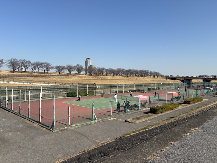 北本通りを渡り、新河岸川の堤防に沿った道路を進みます。河川敷はテニス場になっています。北区営の新河岸川庭球場は、ハードコートが5面あり、ナイター設備はありません。東京メトロ南北線・埼玉高速鉄道「赤羽岩淵駅」から徒歩約6〜7分のところに位置していますので、いつも利用者がプレイしています。