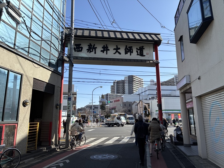 さくら参道と尾竹橋通りの西新井駅入口交差点に、西新井大師道のアーチが架かっています。この道は江戸時代からある他の西新井大師道とは違い、比較的新しい参道です。