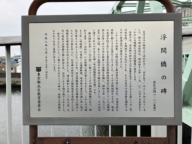 旧浮間橋建設記念碑が国鉄新幹線建設工事に伴い移設されることとなり、国鉄当局と地元代表との話し合いの結果、新幹線工事完了の際、新浮間橋脇に建立される事となった。今般旧浮間橋建設記念碑移設工事完了した事を記念し、小碑を立てる。
