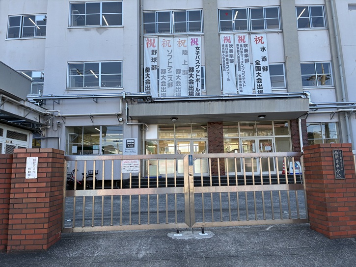 校舎の正面には、沢山の垂れ幕が掛けられています。