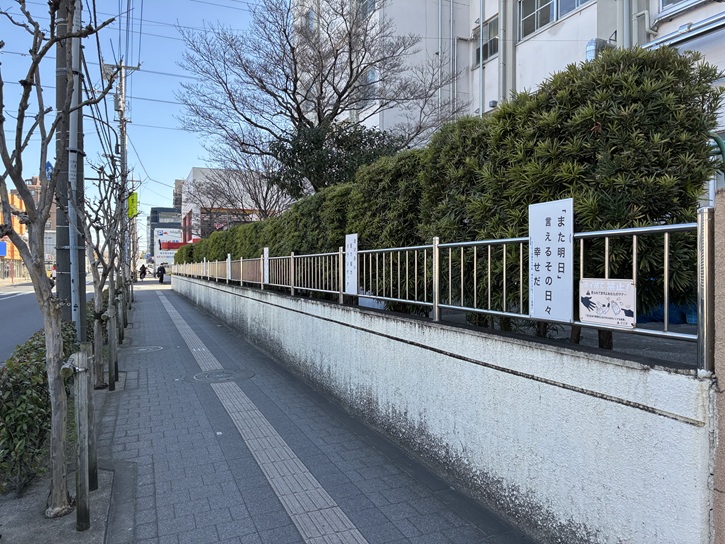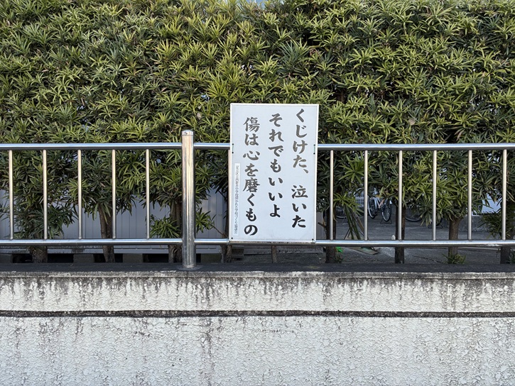 道路に面した塀には多くの標語が並べられています。