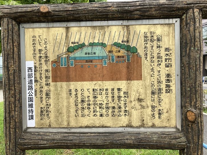 公園に降った雨水が、すぐに外の道路に出て、水害を引き起こすことがないように、この公園には、図のような施設があります。雨水は、まず透水管で地下に浸み込ませます。浸み込まなかった残りの水は、一時的に運動広場の中に貯めて、その後ゆっくりと公園の外に出るようになっています。このような理由で、強い雨の後、公園内に水が貯まっていて、御不便をおかけすることがあります。水害防止のためですので、御理解をお願いします。