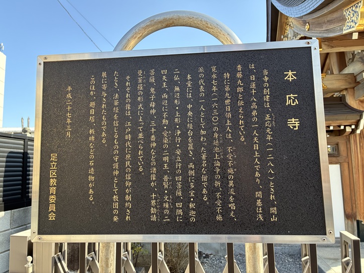 尾久橋通りの交差点角に、本応寺があります。本応寺は、正応元年(1288年)に浅香藤九郎と篠田逸平が開基となり、日蓮十八高弟の一人天目上人を開山として創建されました。浅香藤九郎は、浅賀姓としても伝わり、元は上州の武将で、戦いに敗れて現在の足立区谷在家に落ち延びたといわれています。