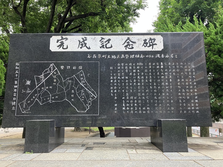 谷在家町土地区画整理組合地域は谷在家町の大部分と、西新井町・上沼田町・北鹿浜町押部・北堀之内町・北宮城町・高野町の各一部を包含した面積約五拾八萬平方米より成る。古くより農事を業として来た静かなこの村落を昭和弐拾年終戦後の急激な人口の流人で雑然とした住宅地に変りはじめ、土地区画整理法にもとづく市街地形成は時代の要求する急務であつた。すゝんでその任に当るべく地区有志は相諮って準備委員会を結成し、昭和参拾九年貳月拾壹日設立認可を得て当組合は発足した。以来幾多の困難に遭いながらも、関係官公庁の指導、組合員及び役員の和合と努力と忍耐によってこれを克服し今日の完成となった。こゝに将来の発展を希い、碑石に刻して後世に伝える。