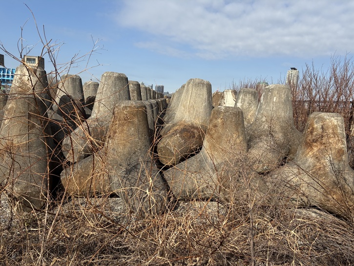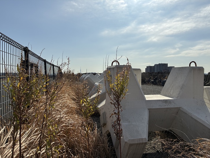 荒川放水路で最大の弱点だった京成本線荒川橋梁の架け替え工事が始まっています。令和元年(2019年)10月の台風第19号による増水で、荒川橋梁の線路のスレスレまで水が迫りました。この箇所は線路を通すために堤防が一段低くなっていますので、ここが決壊すると東京の東部一帯は水没してしまうのです。現在は、暫定措置として、周辺の堤防の高さに比べて低い堤防部分に特殊堤(パラペット)が設置されています。