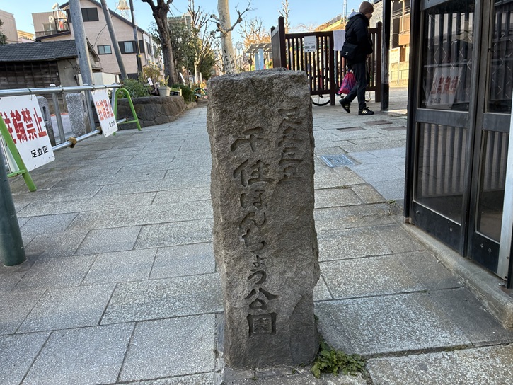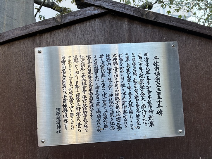 その向かい側には、千住高札場跡の石碑が建っています。ここは千住宿の外れに当たったことから高札場が設置されたのでしょう。平成元年(1989年)に建立されたそうです。