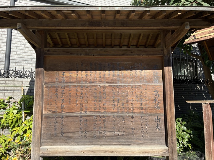 入口の奥には高札場が再現されていて、その由来が記されています。江戸時代には、いろいろな禁制を一般に布達する方法として、高札の制度がありました。各役所からの達しを名主宅の門前や村内の十字路等の高札場に掲げて、庶民に周知徹底を図ったのです。