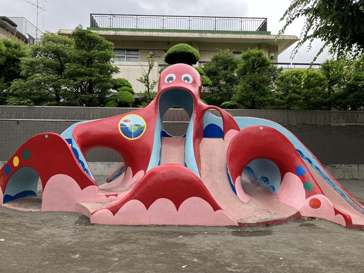 園内には、赤と青でペイントされたタコのすべり台があり、子供たちの人気者となっています。他には複合遊具やブランコもありますが、どれもカラフルな色使いで楽しい気分になります。園内には植栽や植え込みも多く、自然にも触れられる公園です。