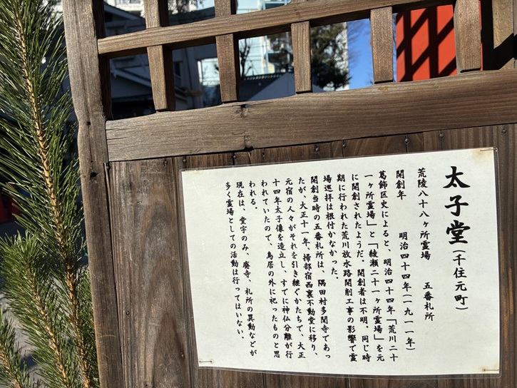 葛飾区史によると、明治四十四年「荒川二十一ヶ所霊場」と「綾瀬二十一ヶ所霊場」を元に開創されたようだ。開創者は不明。同じ時期に行われた荒川放水路開削工事の影響で霊場巡拝は根付かなかった。開創当時の五番札所は、隅田村多聞寺であったが、大正十一年、掃部宿西裏不動堂に移り、本宿の人々がそれを引き継ぐかたちで、大正十四年太子像を造立し、すでに神仏分離が行われていたので、鳥居の外に祀ったものと思われる。現在は、堂字のみ、廃寺、札所の異動などが多く霊場としての活動は行ってはいない。