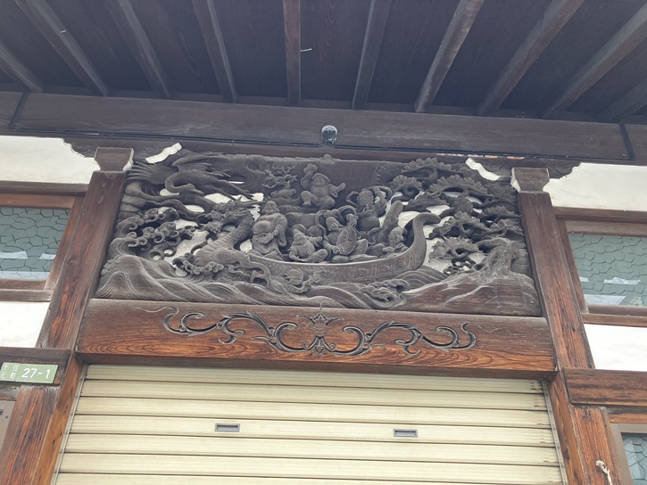 元宿神社の直ぐ先の帝京大学分館の角を右折して、南側にひとつ入った小路を進みます。左手に古風な銭湯があります。「タカラ湯」の銭湯の名の通り、軒下には宝船の彫り物が掲げられています。タカラ湯は、昭和十三年(1938年)に建てられたという見事な門構えに加え、「キングオブ縁側」と称される日本庭園を望む立派な縁側や、昭和の風情が残る開放感と清潔感のあるお風呂など、数々の魅力で老若男女に愛されています。