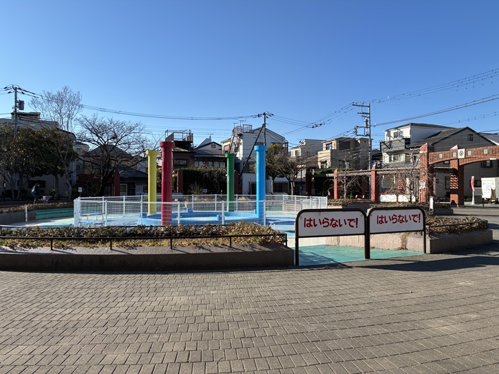 4色の円柱に守られた子どもに人気の丸いじゃぶじゃぶ池は、夏には幼児用のプールになります。暑い日に、無料で安全に水遊びができるスポットとして、多くの親子連れに利用されています。